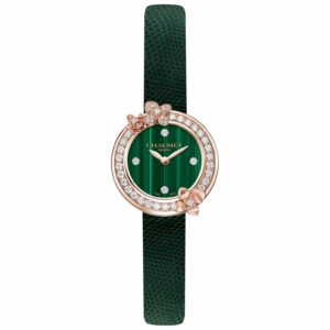 يتميز هذا المزيج الأنيق والخالد، من سوار مصنوع من جلد العجل الأخضر والذهب الوردي، بتفاصيل دقيقة تضيف إلى رقيه جمالاً وحرفية. تم تصميم إطار هذه الساعة بترصيعه بالكامل بالألماس من خلال أزهار الهورتينسيا الناعمة، أما الميناء المضاء فقد تم تصميمه باللون الأخضر أيضاً، مما يزيد على هذه الساعة وعلى قانيتها نعومةً لا حدود لها.
