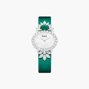تنضح ساعة PIAGET TREASURES جمالاً و جاذبية، مع ما يتخللها من ألماس وأجحار كريمة كالزمرد والياقوت التي تلفت الأنظار ببريقها ورقيها.
